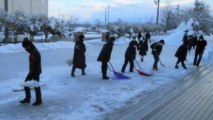 昨日の積雪があったため、除雪当番の3年有志が、除雪を始めました。