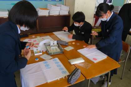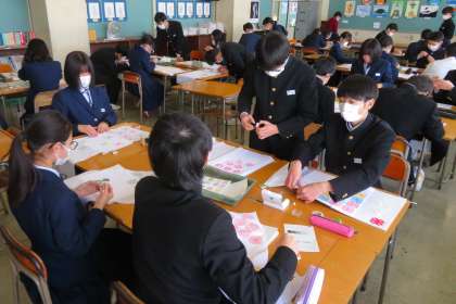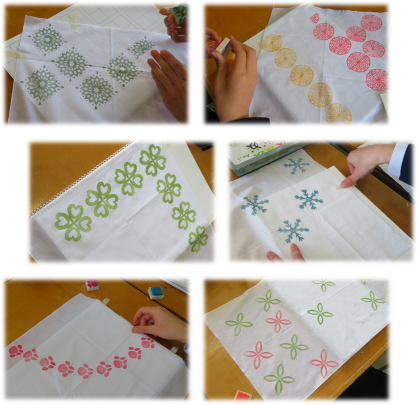 2年・美術・オリジナル手ぬぐい 公開日 2022/02/25 更新日 2022/02/25 2年生 2月25日(金) 3限 2年2組の美術は、「オリジナル手ぬぐいをつくろう」ということで、できたハンコを白い手ぬぐいにスタンプしていました。 スタンプの色やレイアウトを工夫することで、手ぬぐいの雰囲気がグ〜ンを変わってきますね!