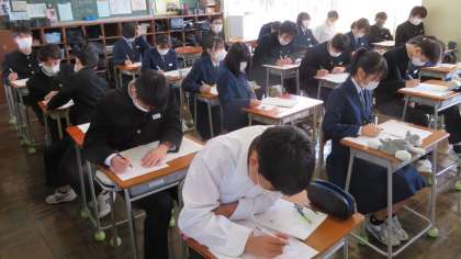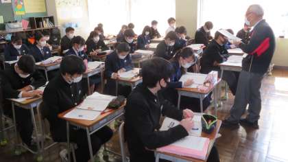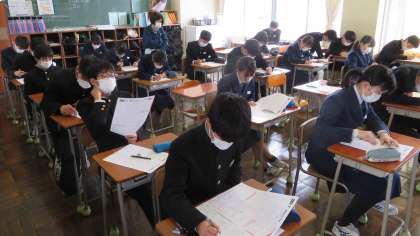 3年・授業風景 公開日 2022/02/28 更新日 2022/03/02 3年生 2月28日(月) 3限 「逃げる」2月も最終日、明日からは「去る」3月です。 県立高校一般選抜も迫ってきました。 3年生は、プリント学習にも集中しています! (写真 上:3年1組 数学の授業) (写真 中:3年2組 理科の授業) (写真 下:3年3組 英語の授業)