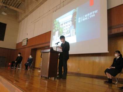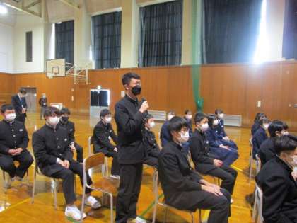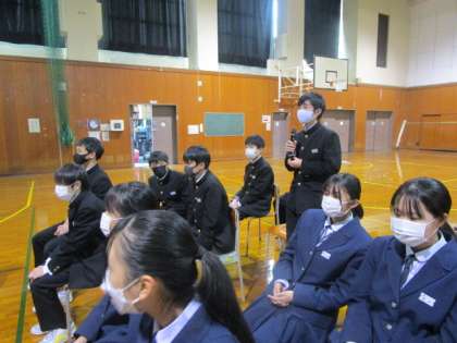 2年・「先輩に学ぶ講演会」・その2 公開日 2022/03/08 更新日 2022/03/08 2年生 3月8日(火) 5,6限 生徒から、「中学校のときはどのくらい勉強していたか?」「部活動との両立は?」などの質問が出ました。 先輩方から、進学先や将来について1年間でじっくりと考えてほしいとのメッセージがありました。 (写真 上:先輩の講演 中・下:質問する2年生)