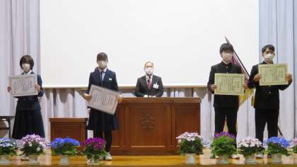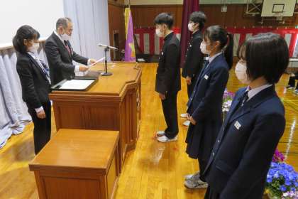 「卒業式予行」が終わったあと、県中体連表彰、県中文連表彰の「授賞伝達式」を行いました。