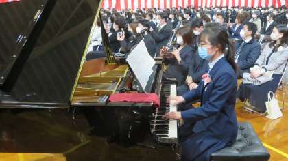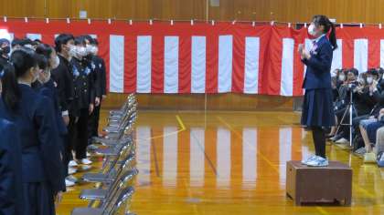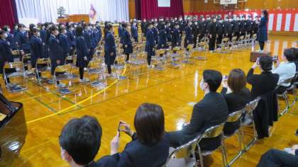 「第39回 卒業証書授与式」・その7 公開日 2022/03/15 更新日 2022/03/15 今日の興南中 3月15日(火) 答辞の後、卒業生が「道」を歌い上げました。 マスク越しですが、思いの詰まった素敵な歌声でした!