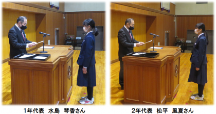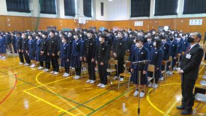 修了式 公開日 2022/03/24 更新日 2022/03/24 今日の興南中 3月24日(木) 9:00 「意見発表会」のあと、「修了式」を行いました。 まず、各学年代表に修了証が授与されました。(写真:上) 次に、校長先生から式辞があり、「修了式の『修』に込められた意味」についてお話がありました。(写真:中) 最後に、校歌斉唱で締めくくりました。(写真:下)