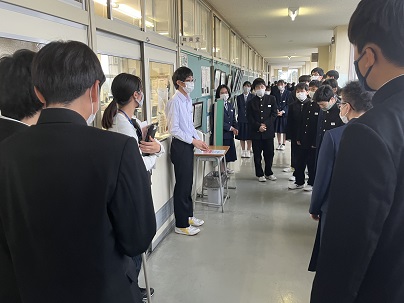 興南中は「生徒会執行部」「代議員会」と9つの「実践部」のいずれかに全生徒が所属します。今日は初めての顔合わせなので、3年生の実践部長から新しい実践部員へ、活動について説明が行われています。