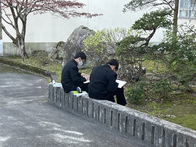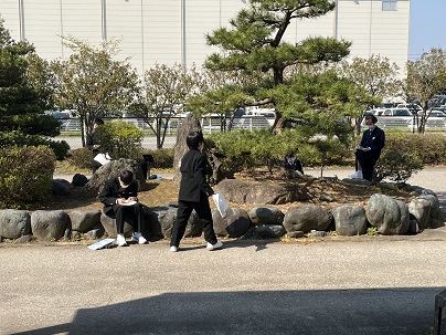 さわやかな天気の下、1年生が校舎前庭で活動していました。