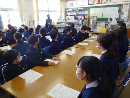 4限に1年生の「図書館オリエンテーション」を行いました。学校司書の先生から本の借り方等を説明してもらい、図書室の利用が始まりました。(写真:1年3組)