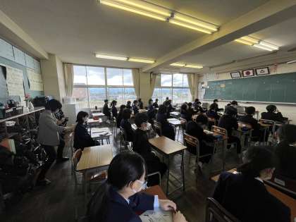 2限 英語 「伝言ゲームです。背中に書かれた英文字を前の人に伝えてください」