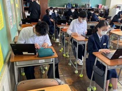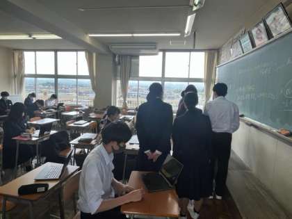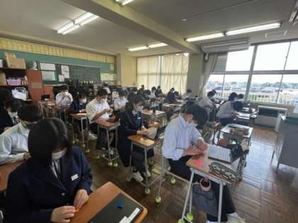 3年生 千羽鶴折り その1 公開日 2022/04/27 更新日 2022/04/27 3年生 班ごとのアドバイスをもらっている間、クラスでは広島にもっていく千羽鶴を折っています。折り方をよく知らない人はクロムブックを使って動画を見ながら折っています!