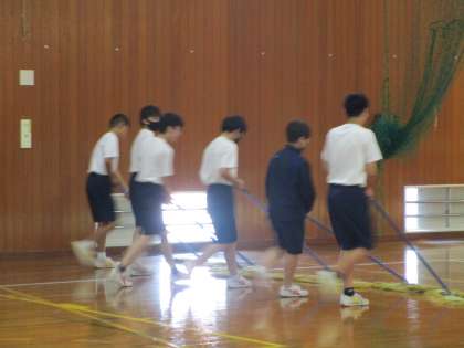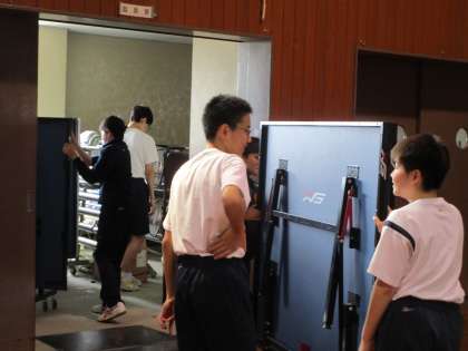 卓球部は練習を終え、卓球台の格納や清掃を部員みんなで行っています。
