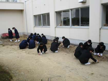 1年生・初めての朝ボラ 公開日 2022/05/10 更新日 2022/05/10 1年生 5月9日 朝 今週の朝ボランティア担当は1年1組です。 1年生にとって、初めての朝ボランティアです。 生徒玄関横の草むしりをしました。