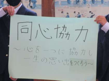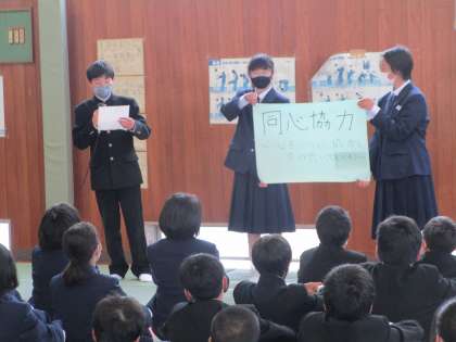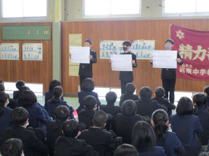 1年生・宿泊学習にむけて 公開日 2022/05/10 更新日 2022/05/10 1年生 昨日の5月9日(月) 5限に1年生は、武道館で学年集会を行いました。 学年生徒会(各学級の書記)から宿泊学習のスローガンが発表されました。 また、生徒が守るべきルールの説明も行われました。 宿泊学習は来週17日〜18日 砺波青少年自然の家に行きます。 (写真 上・中:スローガン 下:ルールの説明)