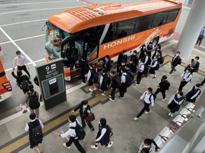 今からバスで平和記念公園へ向かいます。