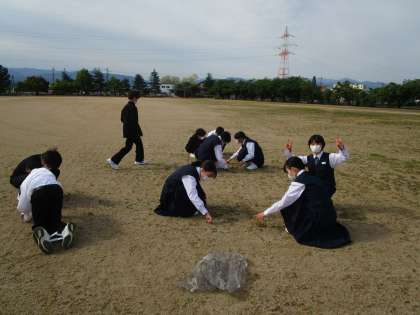 今週の朝ボランティアは1年2組です。 グラウンドの草むしりを行いました。