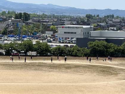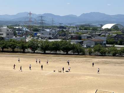 4限 体育 グラウンドでハンドボール投げの測定を行っています。 いい天気です!