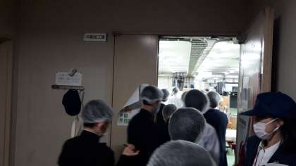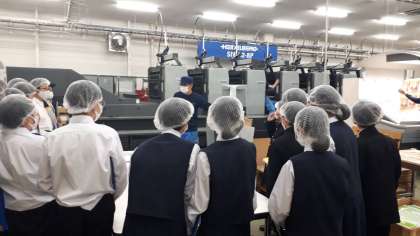 印刷加工課は、髪の毛が落ちないようにキャップをかぶって見学です。