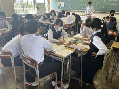 2限 数学 ※ 班で復習プリントの分からないところを教え合っています。