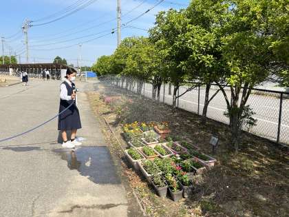 朝ボラは3年1組 元気にあいさつ運動をしています。また、先週、美化実践部が植えたフラワーポットの花に朝から水やりをしてくれています。
