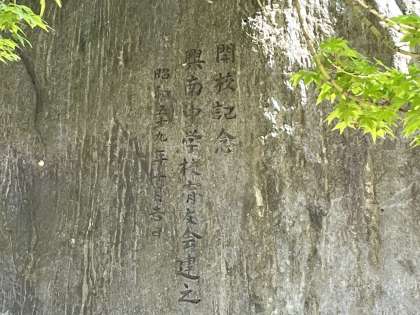 石碑の前にツツジの木が生い茂って、表からは見えなくなっていたのですが、先週、用務員さんに伐採していただき、すっきりと見えるようになりました。