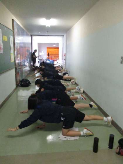 体育館での練習後、全員そろって廊下で体幹トレーニングを行いました。