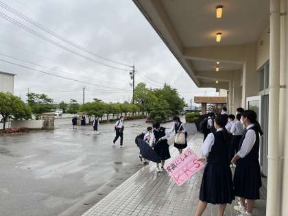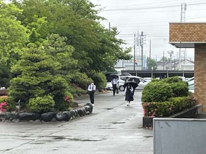 生徒は雨マモマケズ、元気に登校しています。