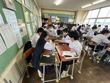 今日の授業風景 3年1組 公開日 2022/06/06 更新日 2022/06/06 今日の興南中 2限 英語 「とだ先生は、あさみにその記事を読むべきだと言いました In English」 ※班で英語に訳してホワイトボードに書いています。