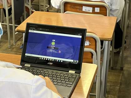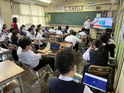 6限に1年3組でALTのマーク先生がクロムブックを使って授業をしていました。大画面に4択の英語クイズを出題し、生徒が自分のクロムブックから時間内に解答します。正解であれば「正解!」間違えると「ハズレ」が出てきます。