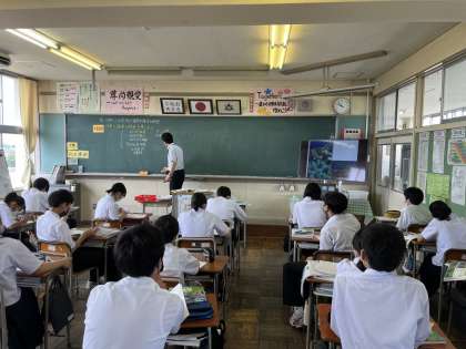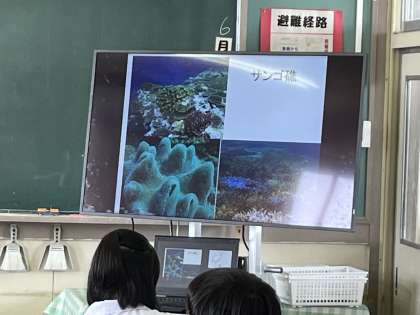 2限 社会 「サンゴ礁が見られるのは沖縄諸島付近ですね。印つけておいてください」