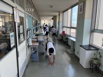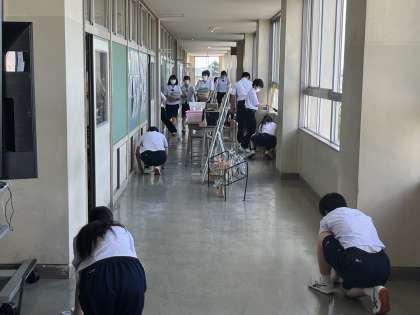 今日の6限は興南中学校創校時からの生徒会伝統行事「校風高揚大会」でした。この活動は学年の枠を超えた生徒全体で奉仕活動を行い、「豊かな人間性」を育むとても素晴らしい活動です。今年度は当初「グラウンドの草むしり」を行う予定にしていましたが、猛暑のため急遽、校舎内の清掃活動になりました。