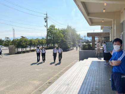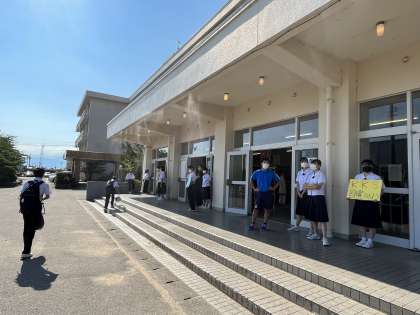 生徒玄関ではミストシャワーが、登校の暑さを緩和してくれています。