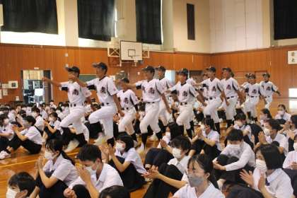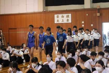 富山県総合選手権大会に出場する陸上競技部、野球部、柔道部、体操部の壮行会を行いました。