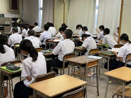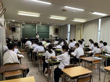 2限 音楽 「課題は『合唱、うたい方のちがいを確かめよう』です。ノートに書いてくださいね」