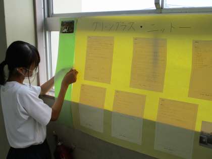 2年生・学校で挑戦中 公開日 2022/07/05 更新日 2022/07/05 2年生 7月5日(火) 社会に学ぶ「14歳の挑戦」2日目、定休日だった2人が学校で、昨日先生たちが撮ってきた写真を事業所別に貼りました。 (写真 上:写真を切る) (写真 中:写真を貼る) (写真 下:写真を掲示する)