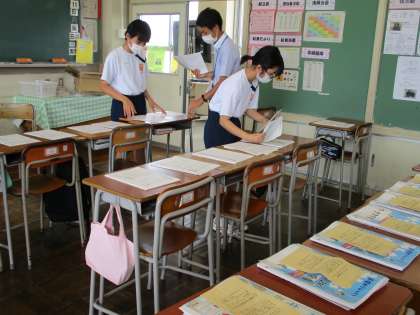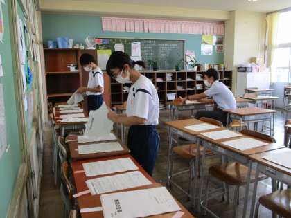 2年生・学校で挑戦中 公開日 2022/07/07 更新日 2022/07/07 2年生 7月7日(木) 社会に学ぶ「14歳の挑戦」4日目、今日が定休日だった2人が事業所別に写真を貼ったり、学年全員分の夏休みのしおりを組んだり、注文した人たちのサマーワークに付属されているテストを組んでワークに挟み込んだりしました。 (写真 上:事業所別に写真貼り) (写真 中:夏休みのしおり組み) (写真 下:テストを組んでワークに挟み込み)