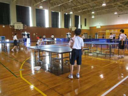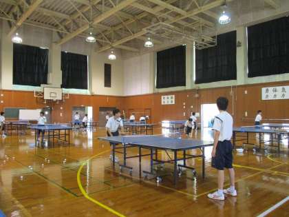 暑い体育館ですが、卓球部は元気いっぱい練習しています。