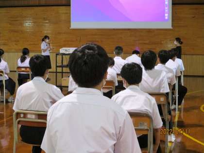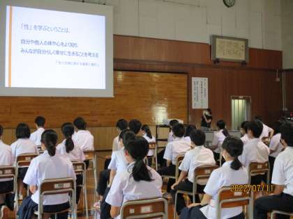 性教育講座 公開日 2022/07/12 更新日 2022/07/12 2年生 7月11日(月) 5、6限 今日の午後、2年生は富山大学附属病院産科婦人科学教室の森田先生による「思春期の性とトラブル」についてのお話を聞きました。 性に関わるさまざまなお話を具体的にしてくださいました。生徒は真剣に耳を傾けていました。 保健実践部の皆さん、準備・進行・片付け等ありがとうございました。