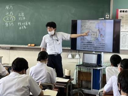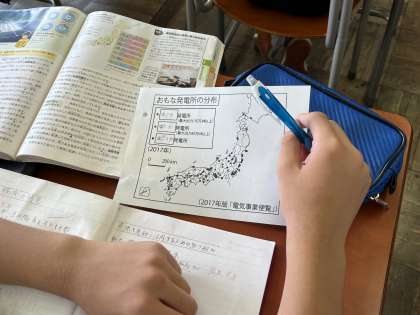 2限 社会 「プリントで、どの印がどの発電を表しているか考えてください」