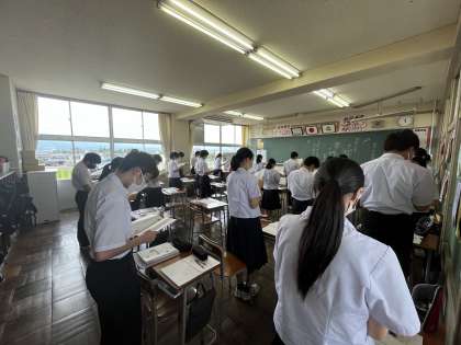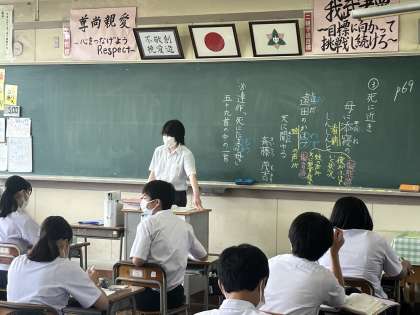 今日の授業風景 2年2組 公開日 2022/07/20 更新日 2022/07/20 今日の興南中 3限 国語 「今からこの短歌を3回読んでください」 「鯨の世紀 恐竜の世紀 いづれにも 戻れぬ地球の 水仙の白」
