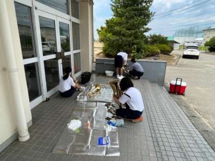 写真:吹奏楽部 楽器をきれいに洗浄しています。高価なものなのでメンテナンスも重要です!