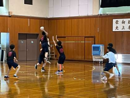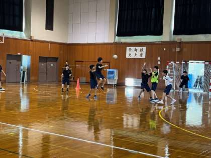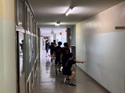 写真:ハンドボール部 体育館練習の前に廊下で基礎練習をしています。地道な練習ですが、とても大切です。