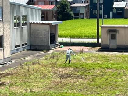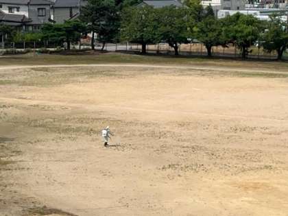 先週から用務員さんが学校敷地内に除草剤を散布してくださっていますが、今日は生徒がいないので、グラウンドに散布しておられます。