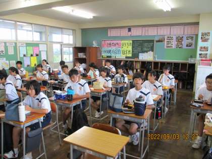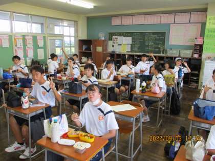 2年生・お弁当の時間 公開日 2022/09/03 更新日 2022/09/03 2年生 9月3日(土) 昼食 午前中にめいっぱい競技や団演技を行ったこともあり、今日のお弁当はいつも以上においしく感じたことと思います。 朝早くから作っていただき、ありがとうございました。 (写真 上:2年1組) (写真 中:2年2組) (写真 下:2年3組)