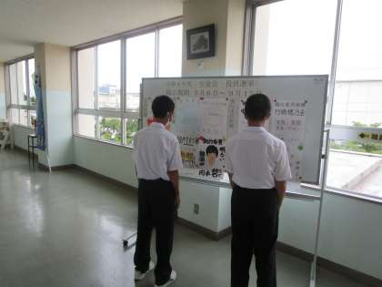 校内でも立候補者のポスターを生徒たちが見入っています。