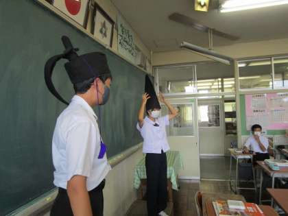 1年生・社会の授業 公開日 2022/09/07 更新日 2022/09/07 1年生 9月7日(水) 2限 1年生の社会科の授業は歴史的分野に入りました。 今日は平安時代の学習です。 「これは何だろう?」 「これを誰がかぶっていたのかな?」 平安時代の貴族の身につけていた「衣冠(いかん)」「烏帽子(えぼし)」を再現したものをかぶって当時の様子を想像していました。