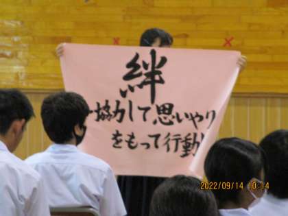 最初に学年生徒会からアンケートをもとにして考えた宿泊学習スローガンの発表がありました。