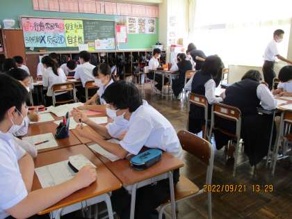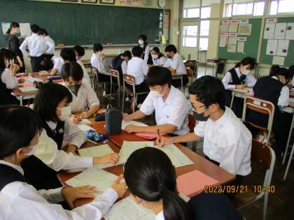 2年生・金沢宿泊学習について 公開日 2022/09/22 更新日 2022/09/22 2年生 9月21日(水) 学活 今日は自分たちが行く金沢班別学習のコースをしおりに書き込みました。 また、バスで座る席を決めたクラスもありました。 クラスによっては合唱コンクールのクラス目標の案を考えているところもありました。 (写真 上:2年1組) (写真 中:2年2組) (写真 下:2年3組)