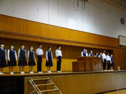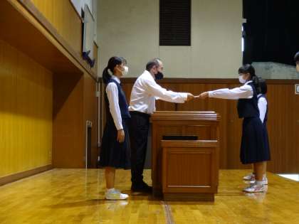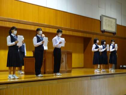 生徒会役員任命・認証式 その1 公開日 2022/09/23 更新日 2022/09/23 今日の興南中 本日、4限に生徒会役員任命・認証式が行われ、生徒会の中心が3年生から2年生に受け継がれました。 初めに前期生徒会長から退任の挨拶があり、できたこと・できないことを振り返りながら、「毎日が楽しく充実していた。これからの興南中の発展のために残りの半年間も1・2年生をサポートしていきたい」と述べられました。 続いて、校長先生から新執行部に任命書が手渡されました。