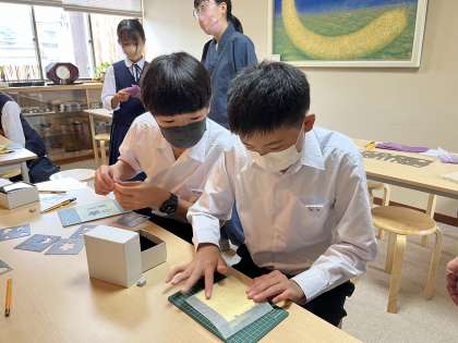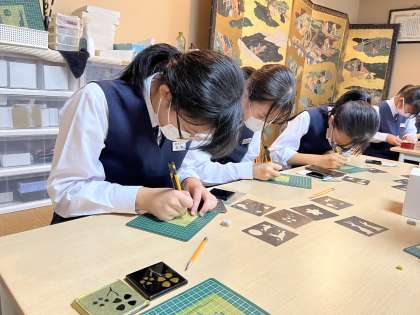 テープを好きな模様の形に切り抜いて、金箔を貼っていきます。