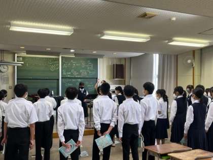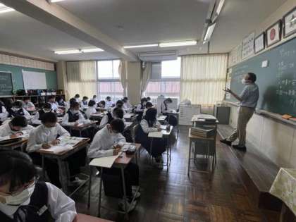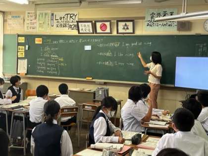 写真中:1年2組 英語 「『得意だ』はgood at 〜ing です」