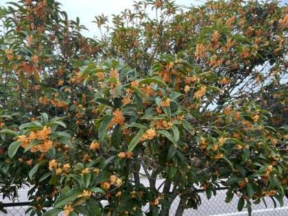 前庭の金木犀(キンモクセイ)が咲いています。 公開日 2022/10/03 更新日 2022/10/03 今日の興南中 生徒玄関前に植えてある金木犀が見事に咲き誇り、甘い芳香が学校全体に漂っています。秋を感じる香りですね。しばらく楽しめそうです!