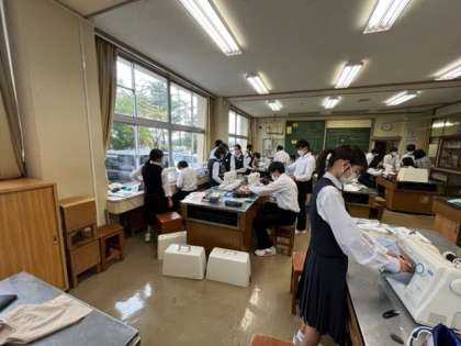 写真中:2年2組 家庭 ※手さげ袋を制作中です。だいぶ仕上がってきました。